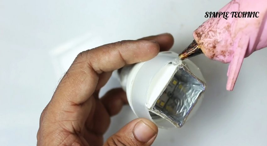 Готовая конструкция закрепляется на светодиодной лампе при помощи термоклея.