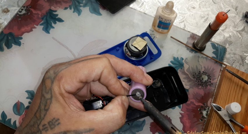 Аккумулятор к корпусу обычно крепится на двойной скотч. Аккуратно отрываем аккумулятор от корпуса, и вынимаем его. Взамен этого, я поставлю новый и проверенный аккумулятор 18650, который имеет ёмкость в 2600 mAh. Эти аккумуляторы я лично проверил работой в powerbank и абсолютно в них уверен. При помощи паяльника, флюса и припоя, лудим контакты нового аккумулятора.