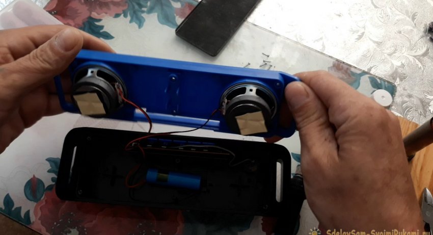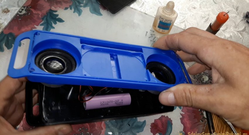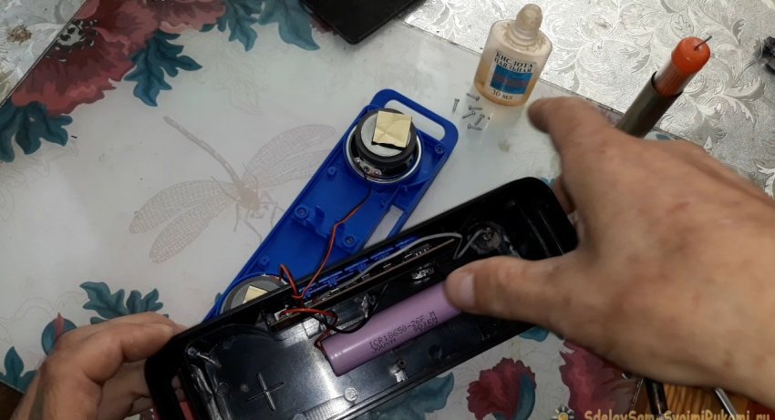 Если скотч пришёл в негодность, то можно усадить аккумулятор на горячий клей. Главное, заранее померить, чтобы новый элемент питания свободно помещался внутри корпуса, и не задевал остальные рабочие элементы колонки, такие как динамики, например. Теперь можно собирать корпус обратно, воедино. Прикладываем верхнюю часть к нижней части, внимательно следя за тем, чтобы нигде не зажало и не передавило никакие провода, и вкручиваем крепёжные шурупы.