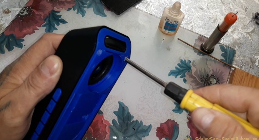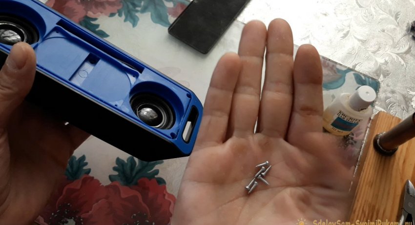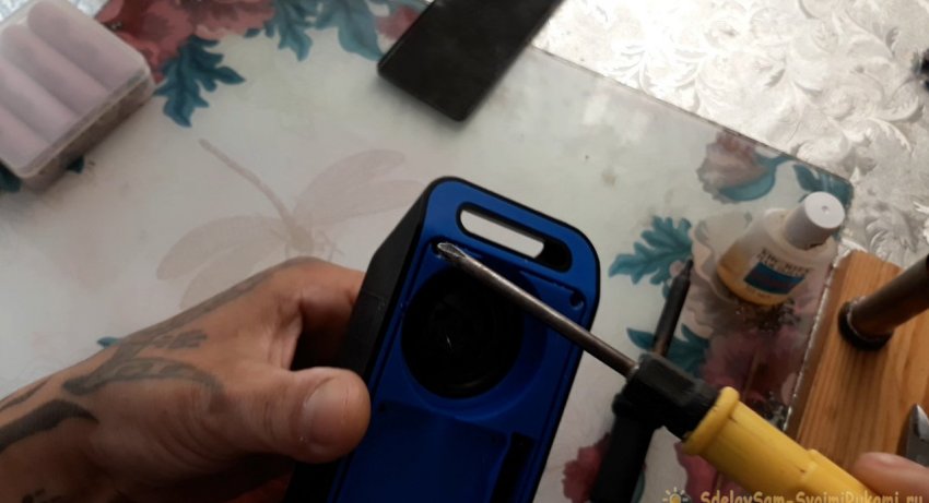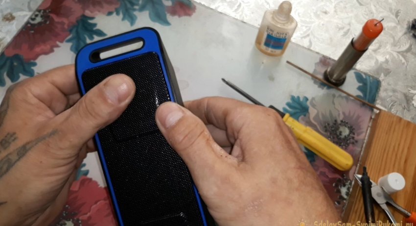 Ничего сверхсложного в предстоящей работе нет. Управится любой! Даже если у человека руки растут не совсем из того места, откуда положено – даже он легко справится с такими простыми действиями. Нужно всего лишь заменить маломощный аккумулятор в устройстве на свой, проверенный и испытанный ёмкий накопитель энергии. Для этого необходимо разобрать устройство. Все музыкальные колонки, хоть и имеют разный внешний вид, сделаны по одному и тому же принципу – скрепляющие корпус винты или шурупы у них, как правило, расположены под защитной решёточкой, которая защищает динамики от внешнего механического воздействия. Снимается эта решёточка-сетка очень просто: нужно подцепить чем-нибудь острым за одну из ячеек, и потянуть вверх. С этим справится и обычный нож.