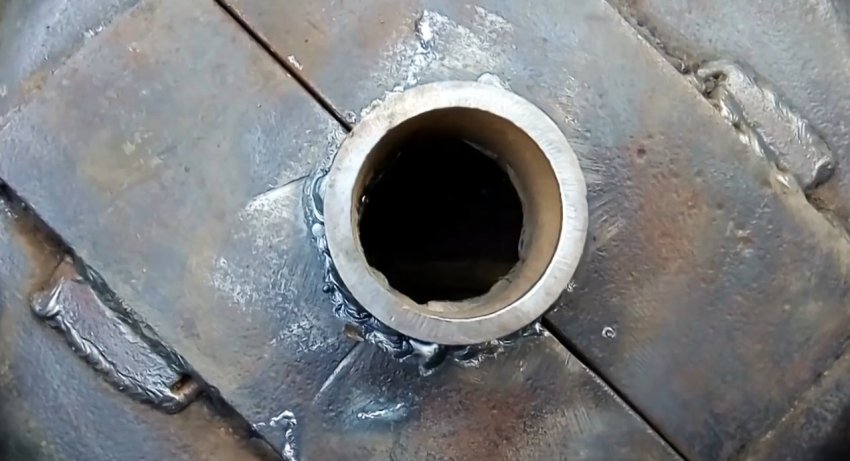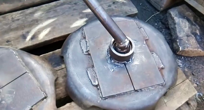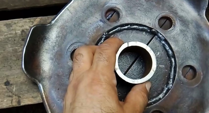 Проведя 3 диаметра, находим центр приваренных пластин и выполняем в них отверстия немного меньше внутреннего диаметра колец, которые привариваем соосно к отверстиям в пластинах.