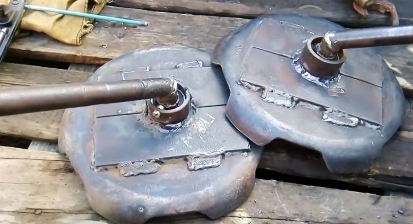В кольца вставляем оси стоек. Причем наружный подшипник будет упираться в выступы отверстий в пластинах и не даст смещаться стойкам. С наружной стороны оси с подшипниками закрепляем гайками. Диски для окучника вполне готовы к установке.