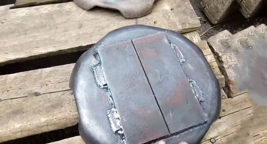 Разрезаем один из листов негодной рессоры от Газели на 4 одинаковых пластины. С помощью двух пластин завариваем центральные отверстия кругов с наружной и внутренней стороны, располагая их симметрично относительно завариваемых отверстий.