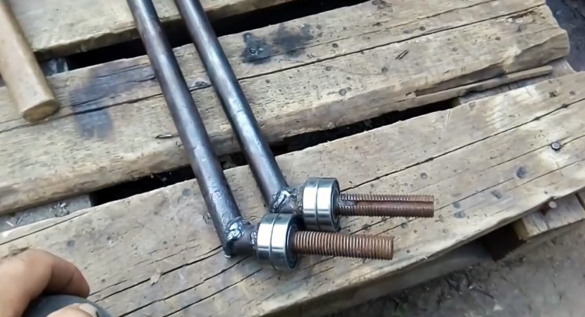 Подержанный вал или ось разрезаем пополам и от концов с резьбой отмеряем такое расстояние, чтобы между линией отреза и подшипниками было не менее 5 см. Отрезанные концы привариваем к остальной части половинок под углом 110 градусов.