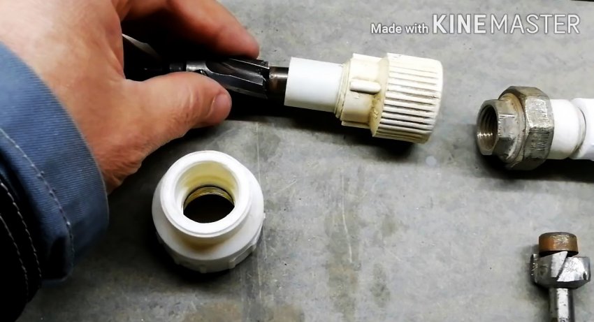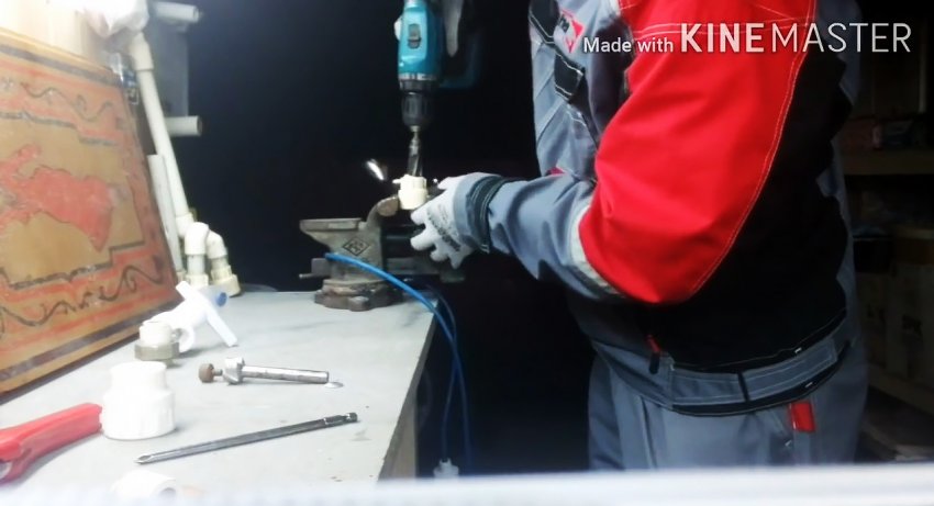 Направляющая должна получиться съемной. В глубине фитингов может быть наплыв пластика, поэтому когда она упрется, то развертка не сможет пройти дальше. Снимая же направляющую, можно ровно высверливать уже начатое отверстие без нее. Желательно, чтобы устройство оснащалось винтом для соединения половинок. Без него направляющая может выпадать, и проваливаться в глубину фитинга.