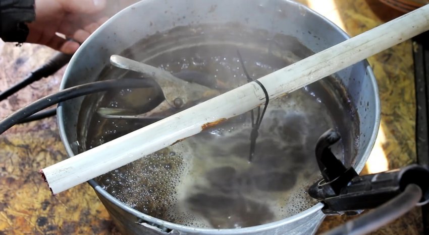 К пластиковой трубке, уложенной поперек ведра сверху, подвешиваем на проволоке очищаемую деталь, выполняющая роль катода, так, чтобы она не касалась дна и боковой поверхности ведра.