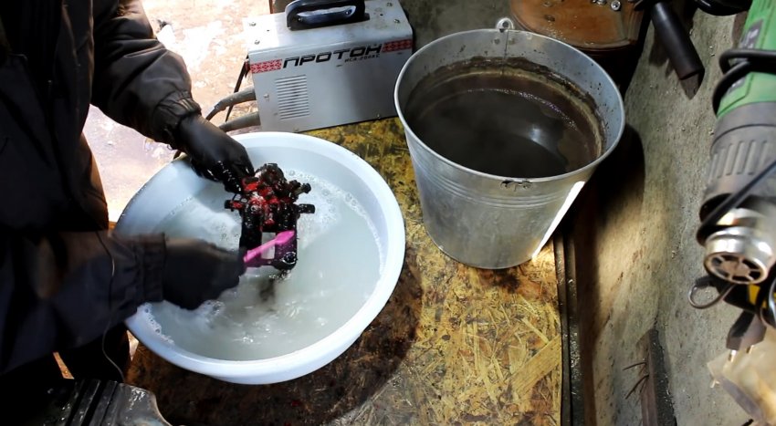 Удаляем остатки краски и другие загрязнения с помощью жесткой щетки в емкости с теплой водой и стиральным порошком. После такой мойки деталь очистилась на 85-90 процентов.