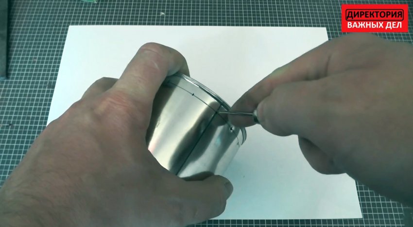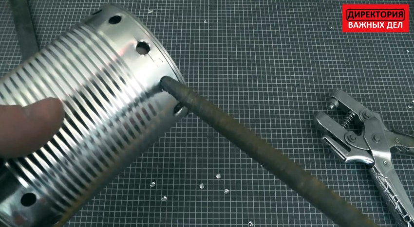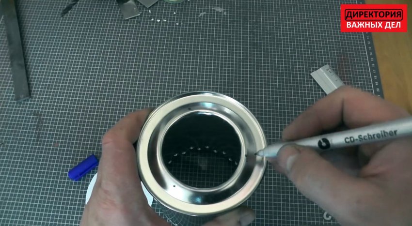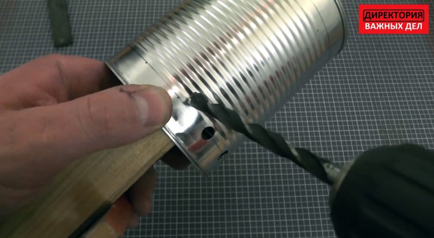 Далее предстоит просверлить банку от отвердителя в крышке. Делается три отверстия для треноги. Они переносятся также и на дно банки от консервов.