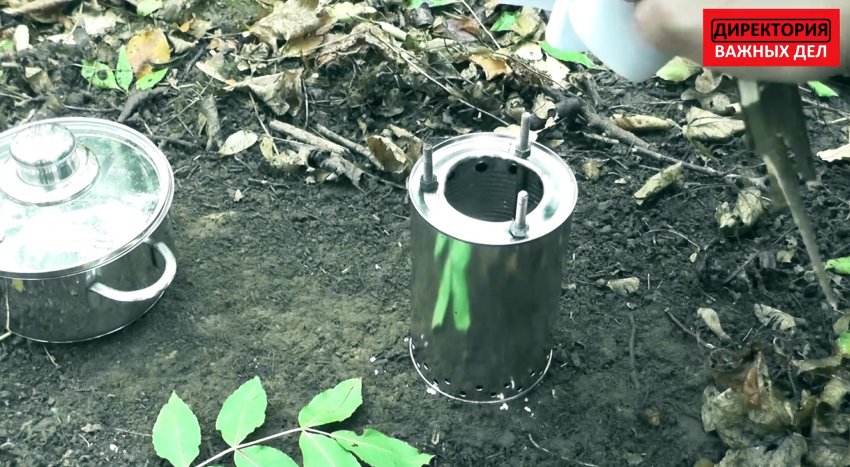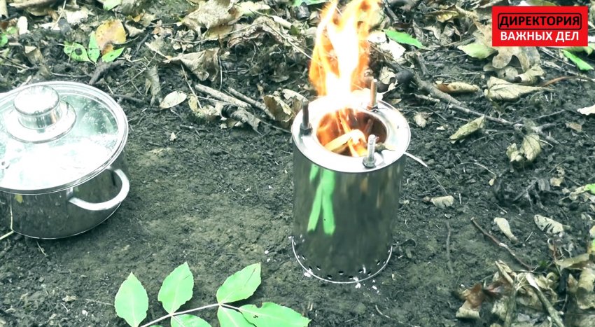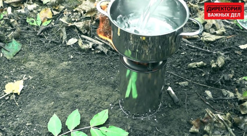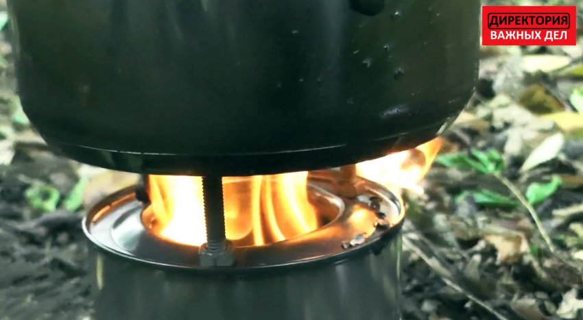 Готовая печка устанавливается на ровное основание. Во внутреннюю банку накидываем щепки, и поджигаем их. После того как стенки разогреются, выброс дыма из печки прекращается. Теперь на нее можно ставить котелок или сковородку. Такая печка при использовании горсточки веток способна вскипятить литр воды за 15 мин, поэтому конструкция очень полезная для туриста, охотника или рыбака.