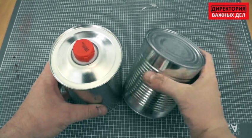 Для изготовления печки потребуется жестяная банка от отвердителя для краски, так как она достаточно высокая. Также подбираем под нее обычную жестянку от консервов. Последняя должна быть короче и меньше по диаметру, чем первую.