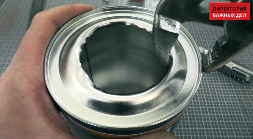 Полученный рваный край необходимо подровнять переставными клещами или другим инструментом. Также у банки от отвердителя удаляется дно.