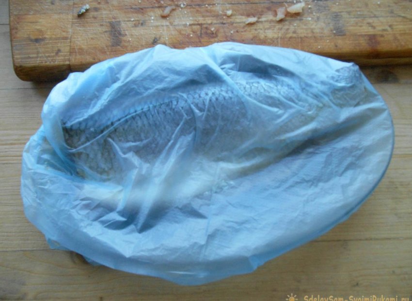 Уложите сельдь на тарелку и заверните в пакет. Уберите в холодильник на сутки. Сельдь получается малосольной, плотной в меру пикантной.