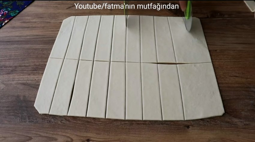 Пласт теста разделите пополам, а затем на полоски, толщиной около 2 сантиметров.