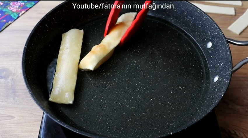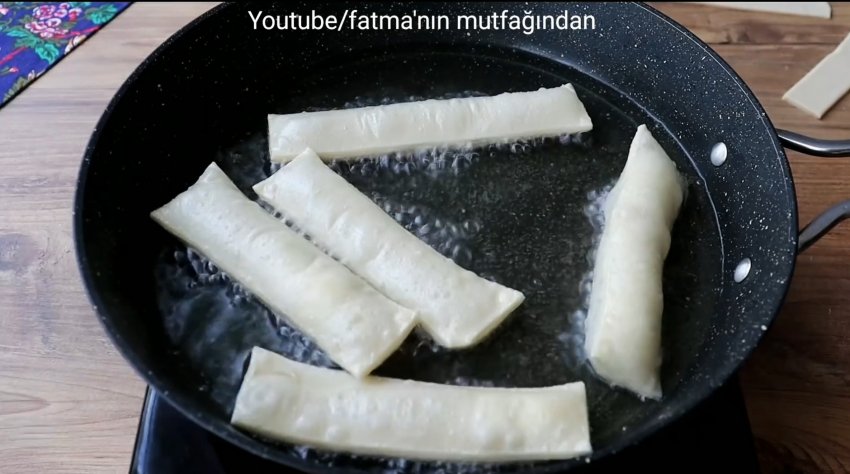 Сковороду раскалите на максимальном огне, влейте примерно 1-1,5 сантиметра масла. Тонкие полоски из теста осторожно опускайте в горячее масло и обжаривайте с двух сторон. Переворачивайте закуску, чтобы она была золотистой со всех сторон.