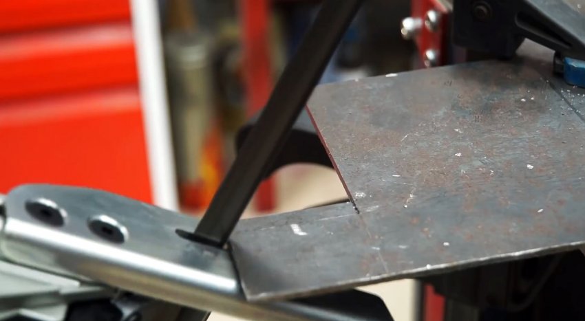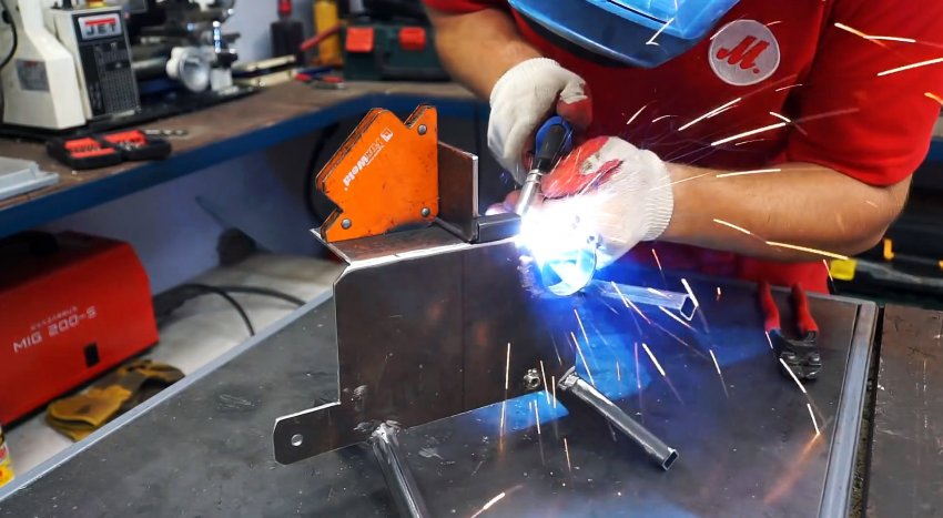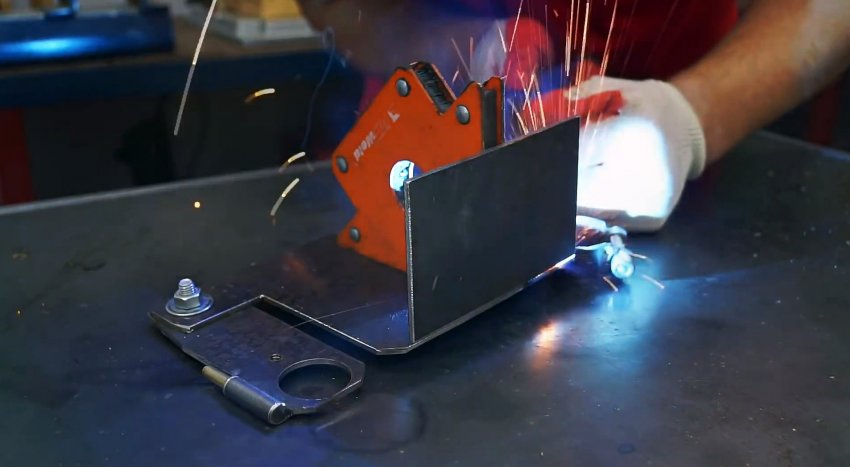 Теперь предстоит сделать опорный столик для размещения деталей при шлифовке. Для этого на боковую пластину приваривается небольшой отрезок профильной трубки. Сам столик делается из листовой стали. Для крепления к трубке, к нему нужно приварить штифт из квадратного прутка 8 мм.