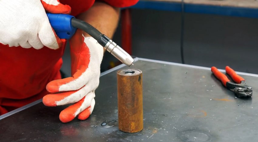 Ведущий ролик станка изготавливается из стальной трубы. Для ее крепления потребуется поставить на шпиндель болгарки шайбу, и накрутить удлиненную гайку М14. Шайба с гайкой свариваются. Затем крепление вваривается в трубку.