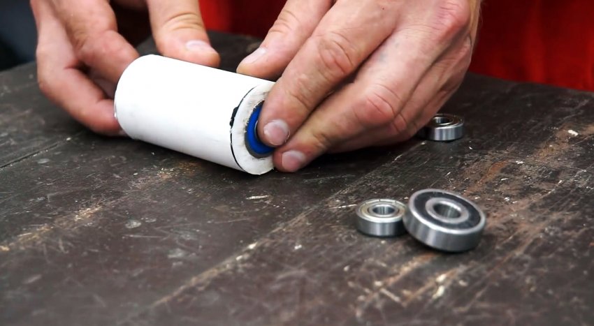 Ведомый ролик можно сделать из полипропиленовой трубы 32 мм. В нее помещается короткая распорка из трубы 25 мм. По бокам впрессовываются подшипники. Затем ролик стягивается шпилькой М10 и гайками.