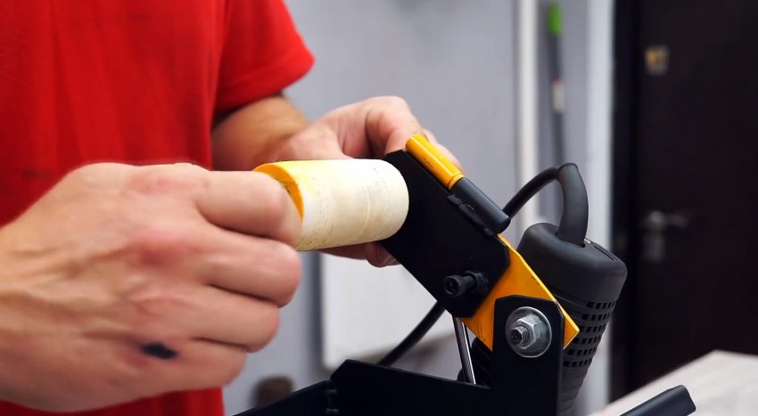 Ведущий ролик накручивается на шпиндель болгарки, а ведомый устанавливается в петлю.