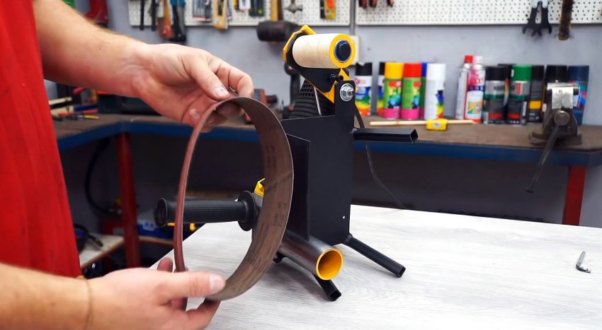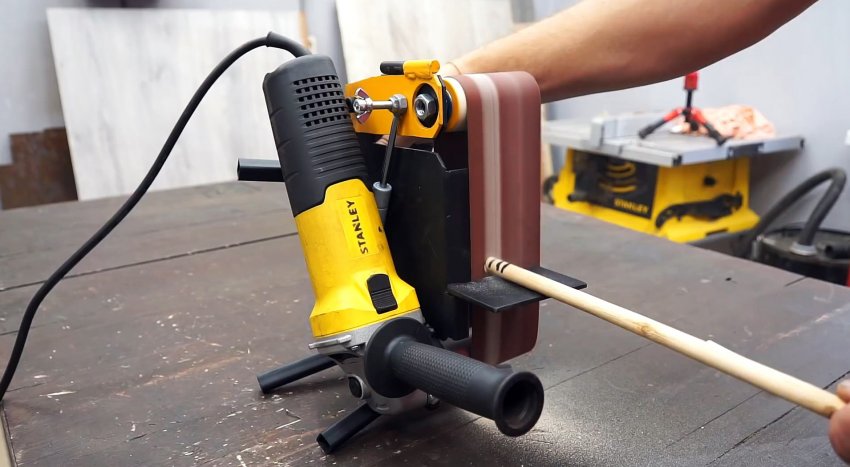 Ленточный гриндер наиболее удобный универсальный вариант для шлифовки и заточки. Им можно обрабатывать плоские детали, выводить спуски на ножах, затачивать практически любой инструмент. В заводском исполнении такое оборудование громоздкое, к тому же стоит далеко не копейки. Предлагаем вариант самодельного компактного гриндера с приводом от болгарки.