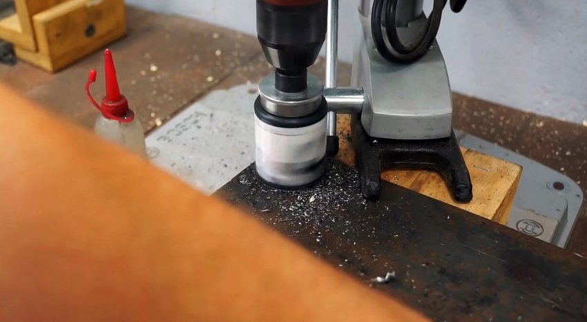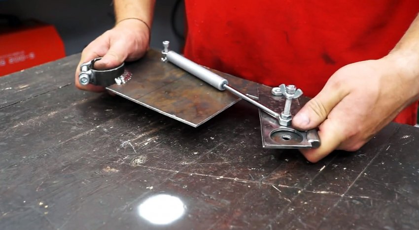 Петлю нужно прикрутить к пластине с хомутом. Далее требуется поставить на заготовку газовый амортизатор. Для его крепления сверлятся отверстия в петле и основной пластине.
