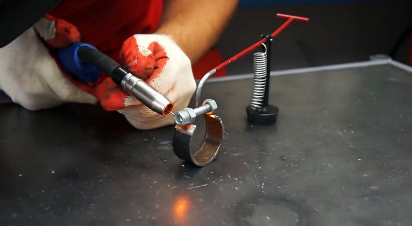 Крепежный хомут дается из отрезка трубы. Кольцо из нее нужно разрезать вдоль, и наварить на края гайки, наживленные на болт.