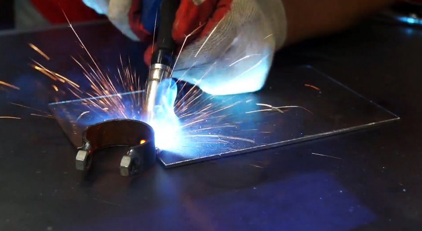 Из листовой стали необходимо вырезать пластину, примерно 150х250 мм. Угол детали срезается для приварки хомута.