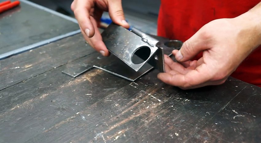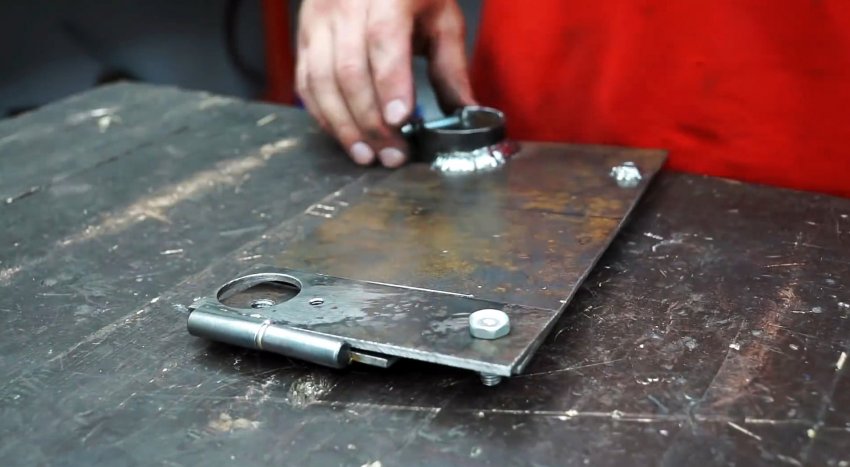 Из полосы и обрезка сваривается поворотный механизм типа дверной петли. В его короткой створке сверлится отверстие под болт М10, и в нем нарезается резьба. Напротив, во второй половине просверливается большое отверстие.
