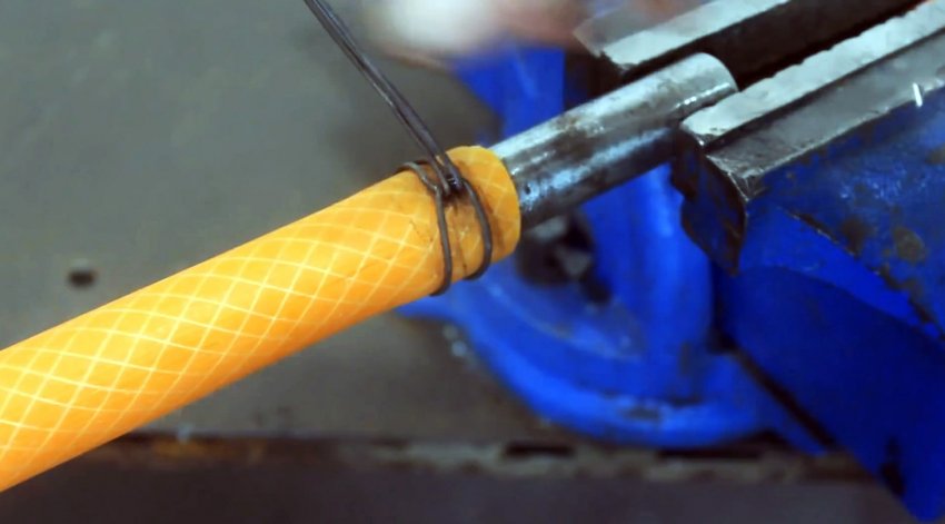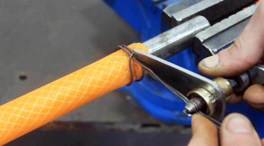 Чтобы воспользоваться хомутателем, нужно сложить проволоку пополам. Она оборачивается на шланг, затем ее край заводится в петлю. В нее упирается проточенная вершина инструмента. Затем концы проволоки вставляют в разрез на штоке. Вращая за вентиль, можно ее затянуть. Теперь остается наклонить инструмент, чтобы загнуть проводку за петлей, и срезать лишнее.