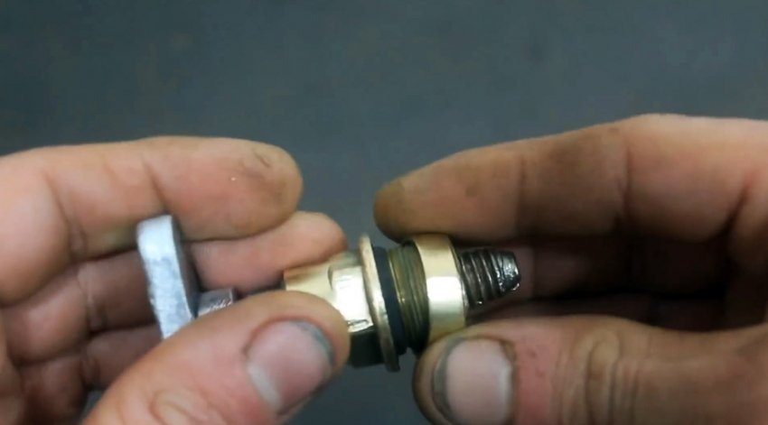 От тройника крана необходимо отрезать резьбовую часть, в которую вкручивается шток. Полученная гайка наворачивается на него. Затем шток зачищается.