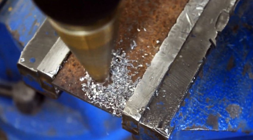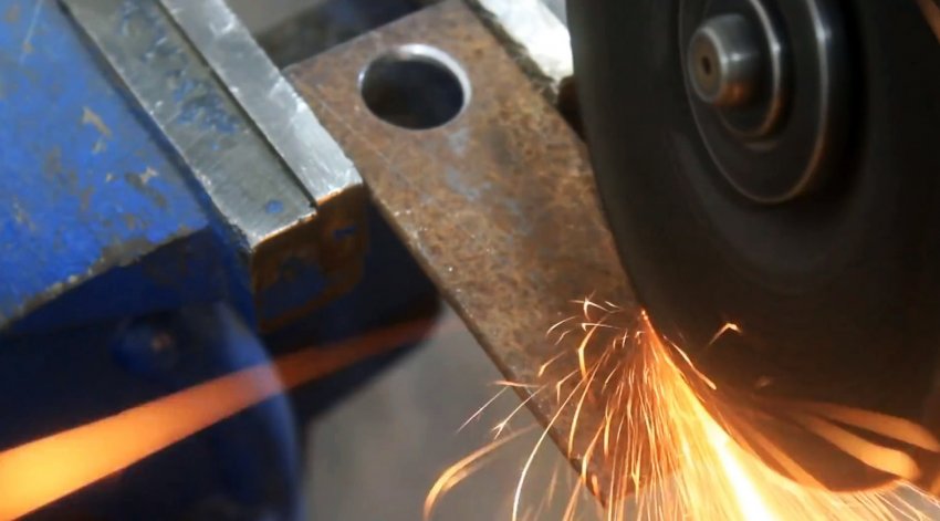 Из листовой стали делается упор для хомутателя длиной 10 см в виде треугольника. В широкой части в нем просвечивается отверстие под шток. На вершине треугольника делается пропил, нижние углы закругляются.