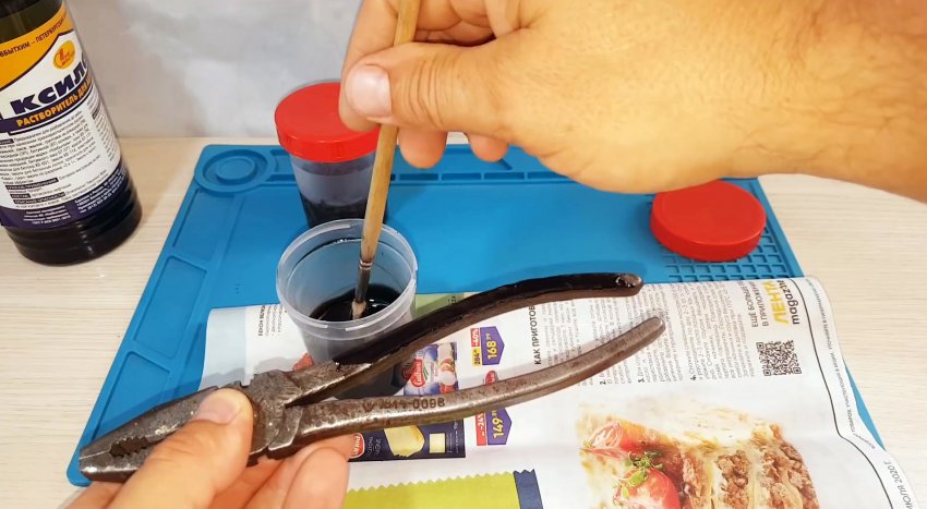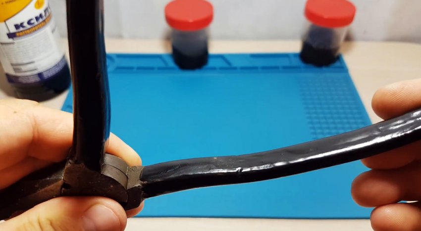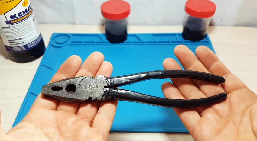 Самодельный пластик отлично пристает к металлу, поэтому им можно покрыть ручки любого металлического инструмента. Просто берем кисточку и как краску густым слоем наносим состав на, скажем, плоскогубцы.
