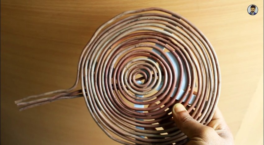 Излучающая катушка плиты представляет из себя «улитку» намотанную виток к витку толстым изолированным проводом 1,5 кв.мм. и состоит из 18 витков с отводом от середины. Витки, чтобы не расходились, приклеены на клеящие полоски.