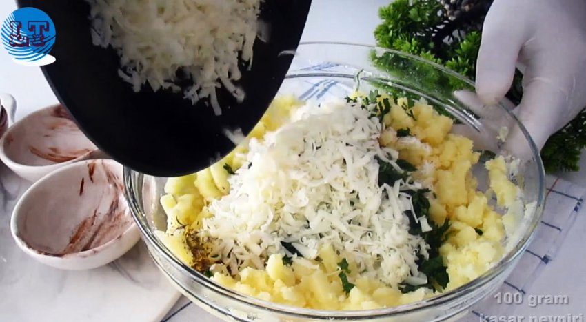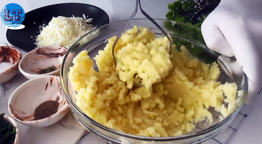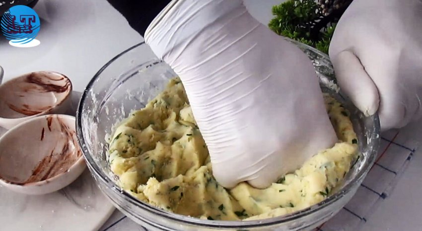 К нему добавляется соль, тимьян, черный перец, рубленая петрушка и натертый сыр. Масса вымешивается, после чего в нее всыпается крахмал. Раньше он не добавляется, так как с ним не получится равномерно распределить специи.
