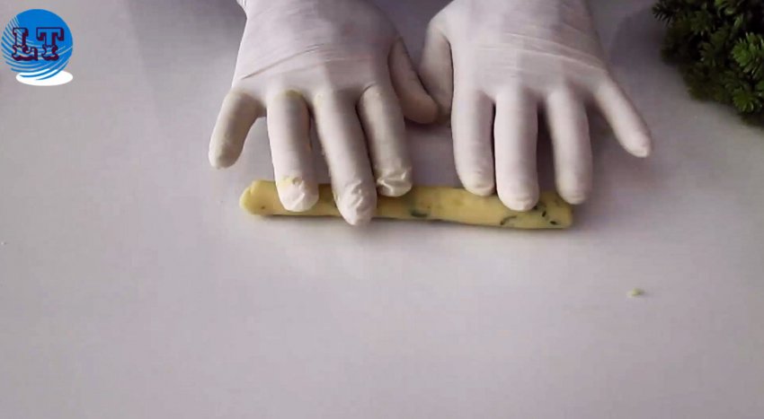 После второго перемешивания приправленное и укрепленное крахмалом пюре набирается понемногу, и скатывается в палочки.
