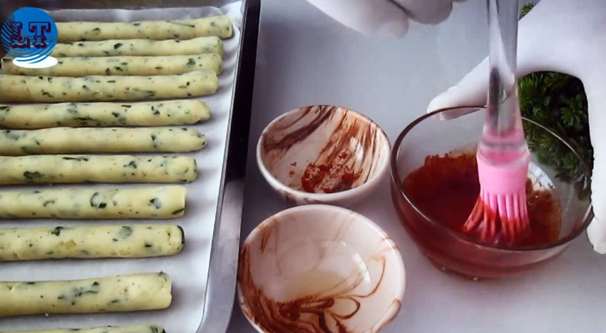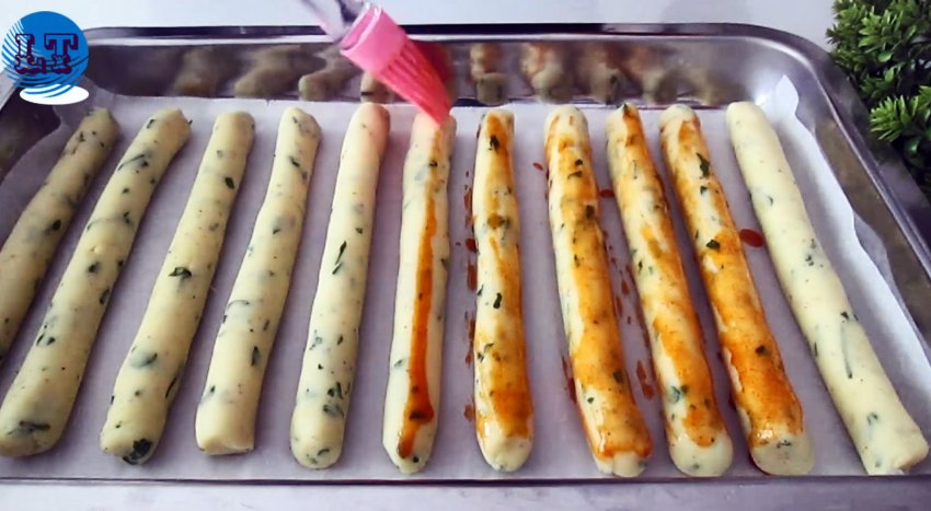 Часть из них можно выложить на противень с пергаментной бумагой, чтобы запечь. Сверху они смазываются смесью растительного масла и красного перца. Запекаются палочки 35-40 мин при температуре 180°С.