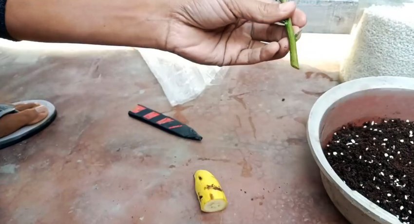 Затем подготавливается черенок. Его нижний срез нужно обновить. Также не помешает срезать в паре мест кору сбоку до камбия, чтобы подготовить плацдарм для прорастания корешков. Затем черенок втыкается в половинку банана.