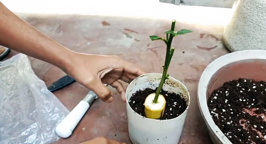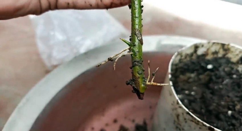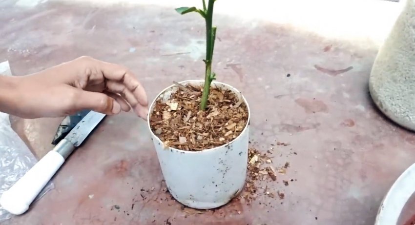 Горшок помещается в затененное место. С мульчей и накрытый пакетом черенок точно не подсохнет, а банан сделает свое дело.