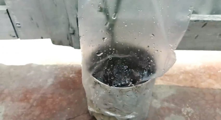 Затем горшок хорошо поливается, и черенок накрывается сверху колпаком из пакета.