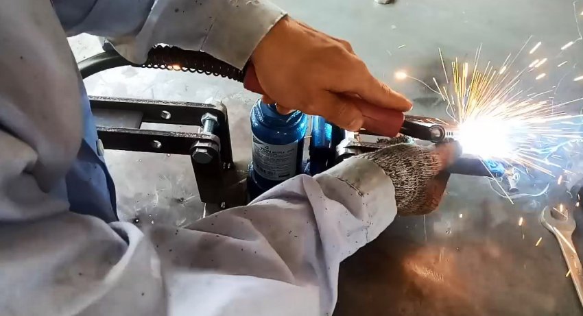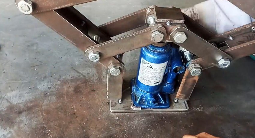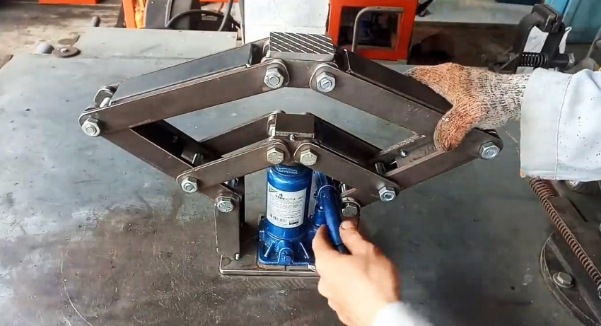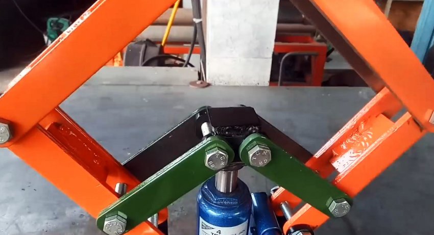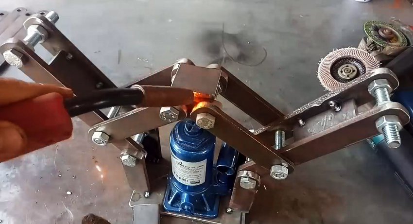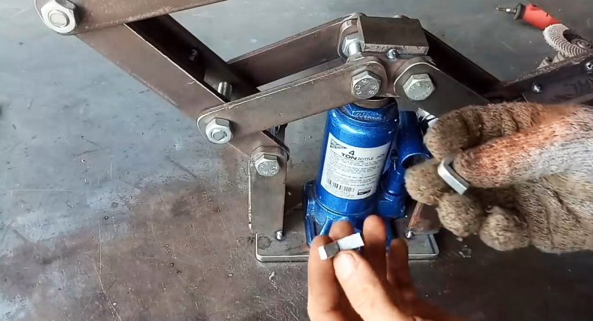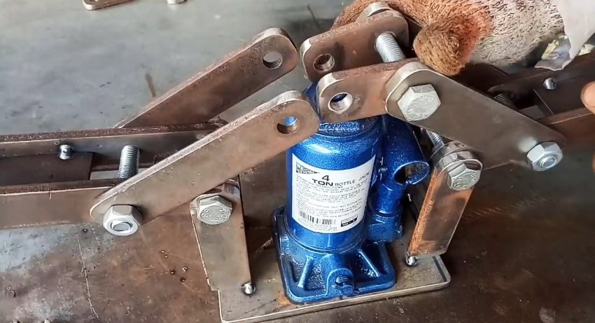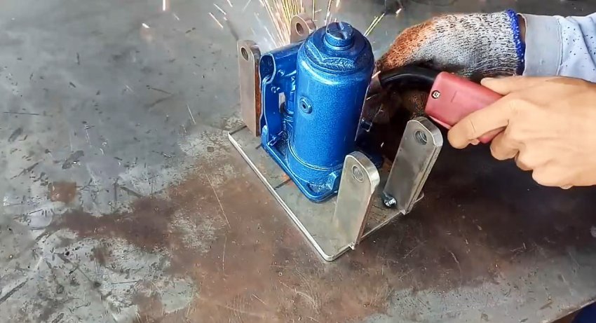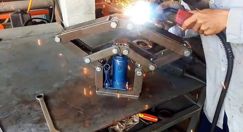 В итоге получаем из двух последних коротких соединяющих пары рычагов основание для площадки, в которую будет упираться шток домкрата. На нее с двух сторон навариваются пластины.