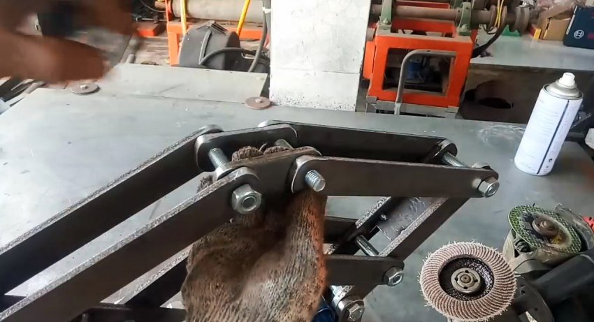 К проушинам присоединяется первая пара рычагов с помощью болтов. Каждая пара сваривается между собой через пластинку. Затем устанавливаются следующие рычаги в центральные отверстия предыдущих.