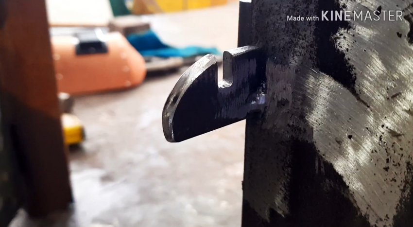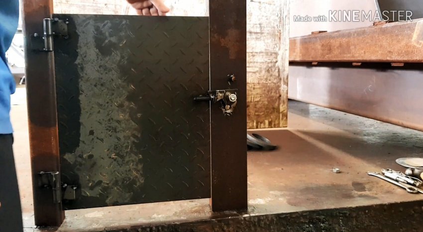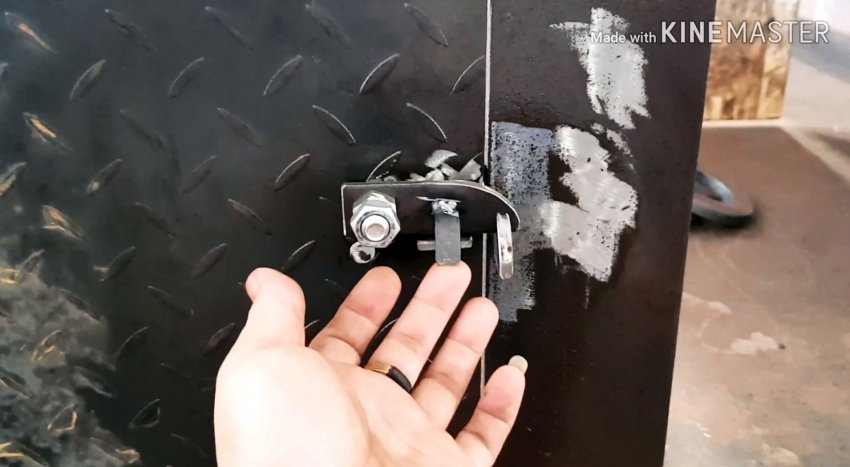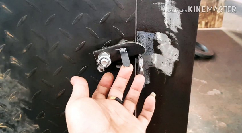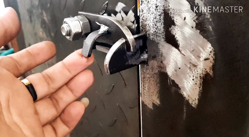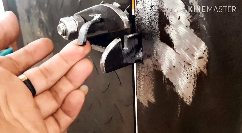Ответная часть в этом варианте делается из полосы. Ее край стачивается под углом, и закругляется. На ней делается пропил, в который сможет падать задвижка, блокируя тем самым дверь.