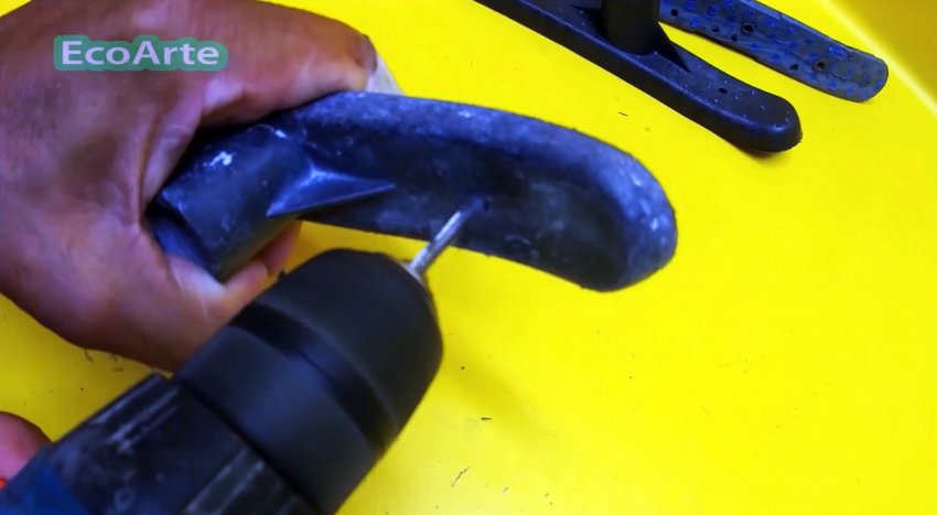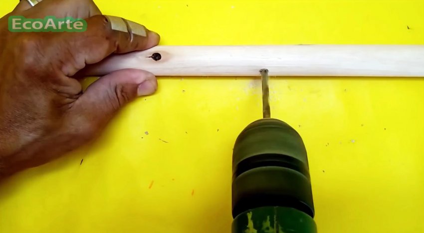 Черенки следует покрасить и просверлить, сделав в каждом по 2 отверстия. Одно сверлится с краю, а второе с противоположной стороны с отступом на треть длины от конца.