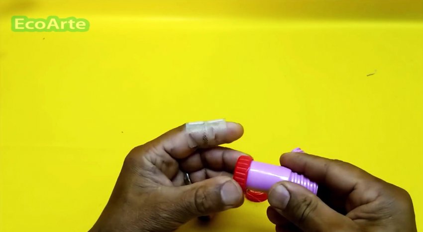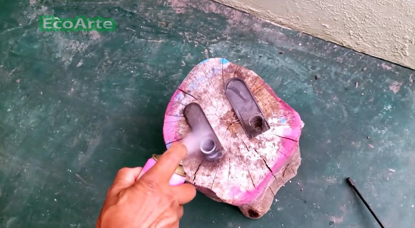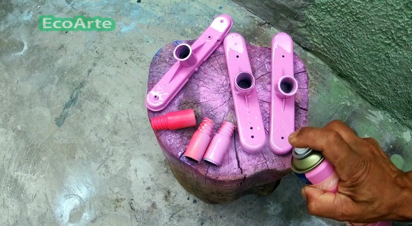 От черенков отрезаем наконечники с резьбой. Их нужно тоже покрасить. Открытые торцы наконечников можно заглушить крышками от бутылок, приклеив их термоклеем.