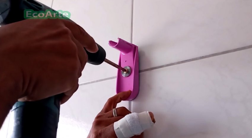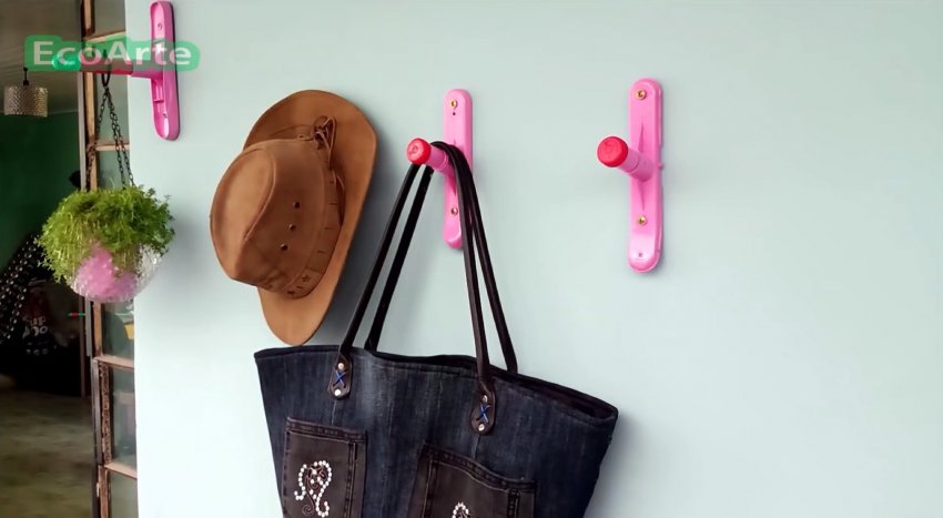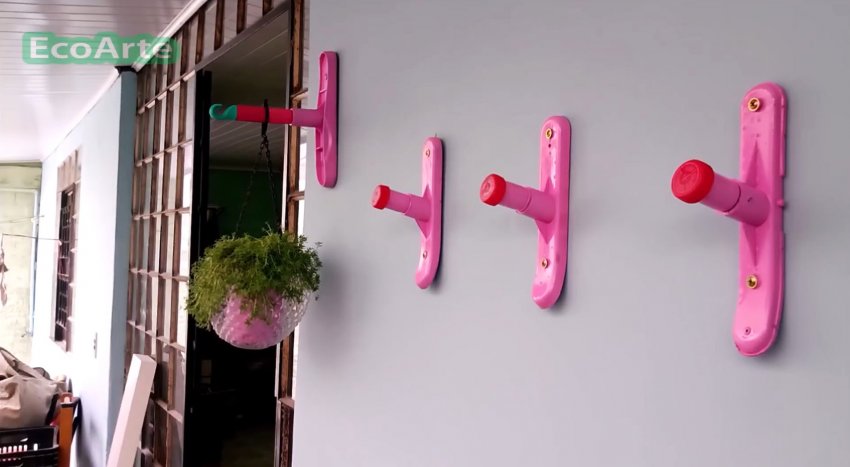 Затем прикручиваем основания щеток на стену, и вкручиваем в них наконечники. В итоге получаем необычную вешалку для шляп, зонтов или сумок.