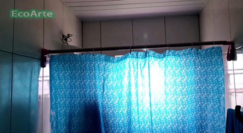 Прикручиваем детали на стены в ванную, и вставляем в них черенок или трубку. Затем навешиваем на карниз шторку.