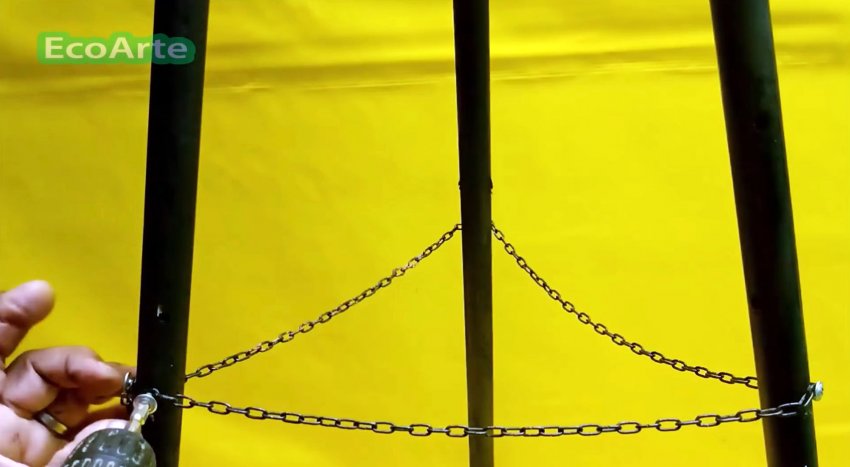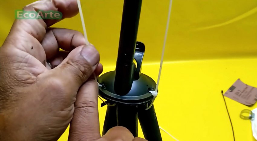 Через крайние отверстия черенки стягиваются пластиковой стяжкой. В оставшиеся отверстия вкручиваются саморезы, которыми нужно зацепить цепочку. В итоге она послужит ограничителем для поддержания ножек треноги при установке.