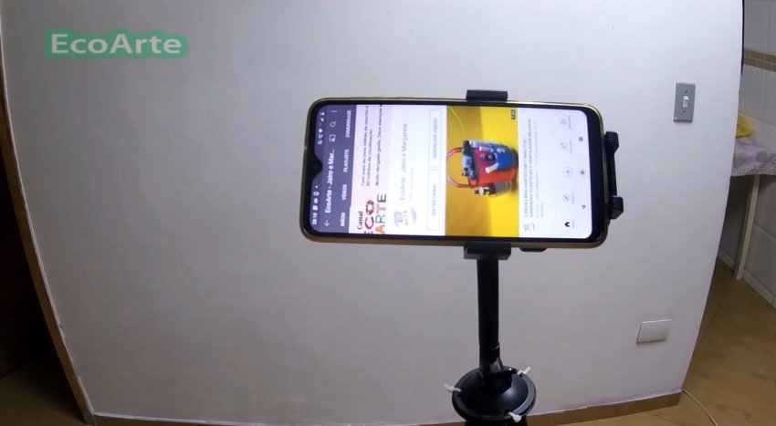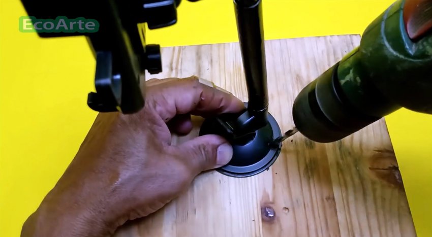 Затем берем подставку под телефон, просверливаем ее подошву, и устанавливаем на треногу стяжкой.