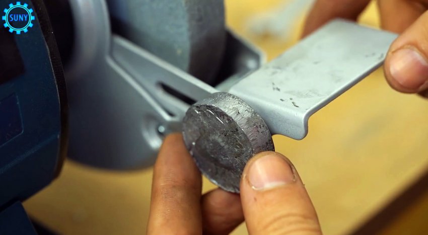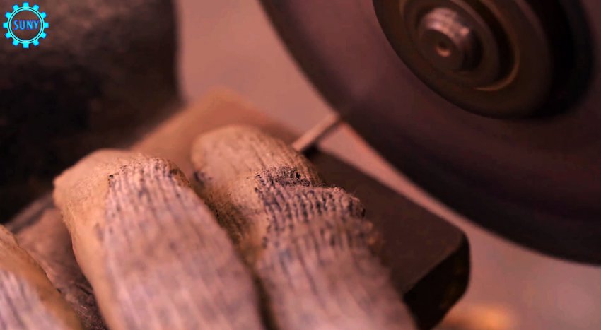Когда металл снова станет твердым, поливаем его водой, и выбиваем ручку. Остается немного доработать заготовку на наждаке, чтобы убрать наплывы.