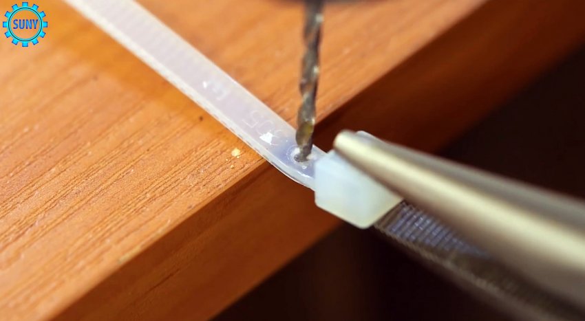 Затем необходимо просверлить нейлоновую стяжку под него прямо возле замка. Сам замок после этого отрезается.