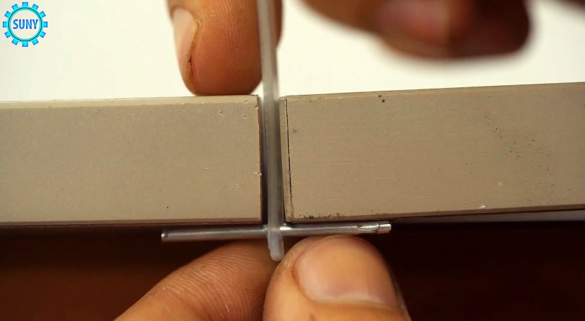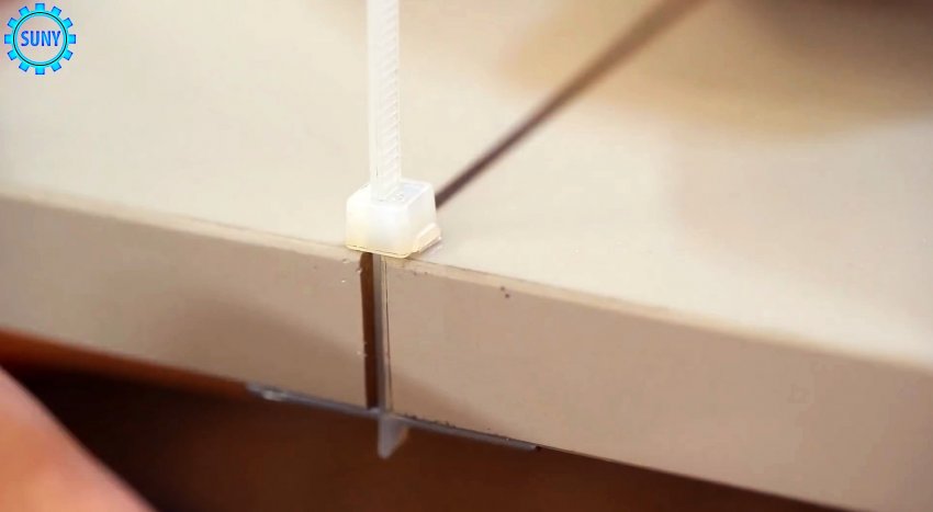 Вставляем стержень в ленту от стяжки, и устройство готово. Если нужно выровнять в один уровень 2 плитки или другой листовой материал, просто ставим между ними стяжку стержнем с изнаночной стороны. Затем нанизываем замок. Он прижмет плитки сверху, убрав тем самым ступеньку.